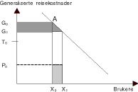 Langs den vertikale aksen, for å finne punktet A, avsettes først hva det koster å reise med bussen, prisen P0, og dernest hvilke tidskostnader målt i kroner som forbindes med gangavstand til holdeplass, ventetiden på bussen samt reisetiden med bussen. Det er en egen profesjon å kartlegge verdien på slike tidskostnader målt i kroner. Dette innebære bl.a. en kartlegging av betalingsvilligheten for redusert gangavstand, samt ventetid, som er høyere enn redusert reisetid i bussen. I tillegg til billettkostnader og tidskostnader innføres en tilleggskomponent, som er et uttrykk for betalingsvilligheten for kvaliteten på andre elementer enn tidskostnader. Dette kan f.eks. være lavgulvbusser, om man får sitteplass samt andre komfortvariable på bussen. Når man har funnet summen av reisekostnader, tidskostnader og kvalitetskostnader for reisen, punktet G0(også kalt reisemotstanden), finner man antallet som reiser når man har denne reisemotstanden, X0, for å kunne avsette det første punktet på kurven for betalingsvillighet, nemlig punktet A. Dette er betalingsvilligheten for den marginale brukeren som reiser med bussen i dag. Kurven for betalingsvilligheten ut fra dette punktet viser nå en negativ sammenheng som er slik at jo høyere reisemotstanden er, jo færre reisende er det. Den stigende kurven til venstre for punktet A viser den maksimale betalingsvilligheten til de som reiser med bussen i dag. Arealet under kurven fra punktet A er den samlede betalingsvilligheten eller den samlede nytten av å bruke dette tilbudet for alle brukerne.