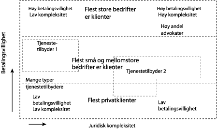 En kan tenke seg at en advokat vil kunne dekke hele området, med andre ord påta seg alle typer oppdrag. I praksis vil imidlertid én advokat vanligvis holde seg til en viss kundetype og et begrenset saksfelt med en viss vanskelighetsgrad. I figuren er dette illustrert ved de to feltene som markerer arbeidsfeltene til de tenkte tjenestetilbyderne 1 og 2.