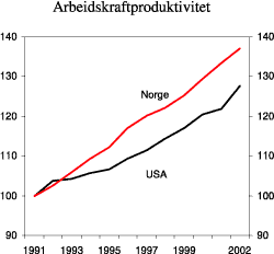 Økt kjøp av tjenester fra andre sektorer i norsk økonomi og utsetting av delproduksjon til andre land vil slå ut i redusert sysselsetting og økt bruk av produktinnsats. Utviklingen i produktinnsatsbruken i industrien representerer et grovt mål på betydningen av denne typen utsetting de siste tiårene, jf. figur 4.4. Målt ved bruttoproduksjonen har industriproduksjonen økt med i gjennomsnitt 2,2 pst. over perioden 1970-2002. Bruttoproduktet (bruttoproduksjon – vareinnsats) har kun økt med 0,5 pst. målt som årlig gjennomsnitt over den samme perioden.