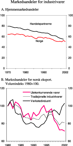 Tradisjonelt sett har det vært industrinæringene (samt utenriks sjøfart og rørtransport) som er blitt regnet som konkurranseutsatte næringer. Siden deler av næringsmiddelindustrien og deler av grafisk industri i stor grad er skjermet fra utenlandsk konkurranse er dette litt misvisende. I tillegg er deler av reiselivsnæringen trolig vel så utsatt for endringer i konkurranseevnen som mange av de tradisjonelle industribedriftene. Målt som andel av den samlede økonomien, har tradisjonelle konkurranseutsatte næringer blitt mindre de siste tiårene. Bruttoproduktet i industrien utgjorde nesten 25 pst. av BNP for Fastlands-Norge i 1970, mens andelen nå ligger på under 15 prosent. Også sysselsettingen i industrien, målt som andel av samlet sysselsetting, har falt fra om lag 25 prosent til 15 prosent.