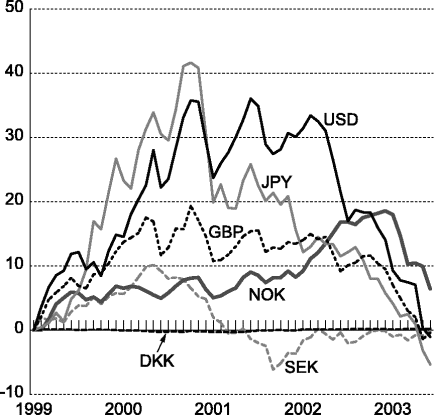 Figur 6-1 Valutakursutvikling. Prosentvis avvik fra gjennomsnittskurs mot euro i januar 1999. Fallende kurve angir svakere valutakurs