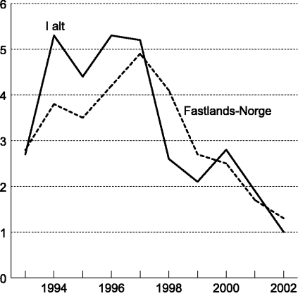Aktivitetsveksten i fastlandsøkonomien har falt gradvis gjennom de fem siste årene og sesongjusterte tall indikerer at BNP i Fastlands-Norge nå har falt to kvartaler på rad. På årsbasis økte BNP i Fastlands-Norge med 1,3 prosent fra 2001 til 2002, mot 1,7 prosent året før. En svak utvikling i både petroleumsproduksjon og utenrikssjøfart bidro til at veksten i BNP i alt var 0,3 prosentpoeng lavere enn i Fastlands-Norge i 2002.