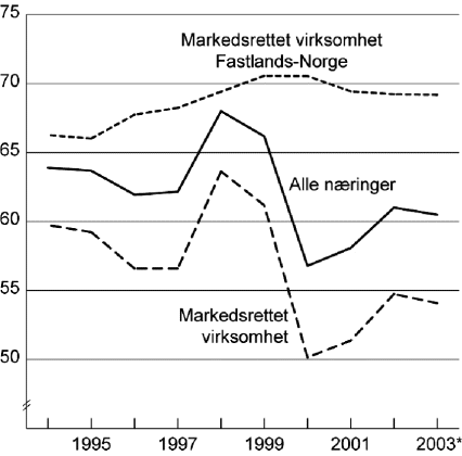 Figurene 1.3 til 1.5 viser hvordan lønnskostnadene som andel av faktorinntekten har utviklet seg over tid for en del næringsgrupper. I markedsrettet virksomhetlønnskostnadsandelen på 1990-tallet forholdsvis stabilt på rundt 60 prosent (jf. figur 1.3). I 2000 falt andelen til 50 prosent, men har deretter økt litt. For 2003 er andelen anslått til 54,1 prosent. Utviklingen i driftsresultatet i petroleumsvirksomheten forklarer mye av endringene i denne andelen.
