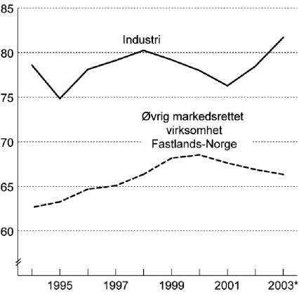 Figur 1.4 viser utviklingen i lønnskostnadsandelen i industrien og i øvrig markedsrettetvirksomhet i Fastlands-Norge. I industrien nådde lønnskostnadsandelen en topp i 1998 med 80,2 prosent. Lønnskostnadsandelen falt deretter jevnt og nådde en bunn i 2001 med 76,3 prosent. I de siste to årene ser den ut til å ha økt, og Beregningsutvalget anslår andelen til knappe 82 prosent i 2003. I øvrig markedsrettet virksomhet i Fastlands-Norge økte lønnskostnadsandelen fra 1994 til 2000 med 5,9 prosentpoeng, til 68,5 prosent og har deretter avtatt jevnt. For 2003 er andelen anslått til 66,3 prosent.