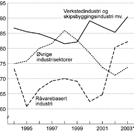 Figur 1.5 viser utviklingen i lønnskostnadene som andel av faktorinntekten for ulike deler av industrien. Etter 1994 har det vært en forholdsvis jevn nedadgående tendens i lønnskostnadsandelen i verkstedsindustrien, helt til 2000 da andelen økte kraftig og kom opp i overkant av 89 prosent. Lønnskostnadsandelen falt i de to etterfølgende årene og nådde 85,3 prosent i 2002, som er på linje med det gjennomsnittlige nivået for siste halvdel av 1990-tallet. Beregningsutvalgets anslår en markert oppgang i lønnskostnadsandelen i 2003, så vidt i overkant av 90 prosent.