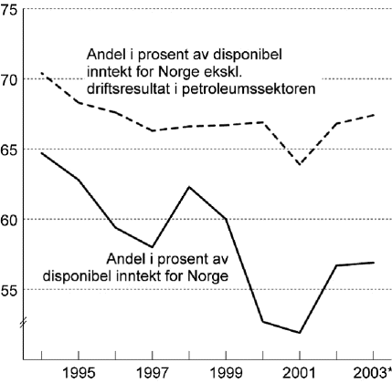 Figur 2.1 viser husholdningenes disponible inntekt som andel av disponibel inntekt for Norge, og som andel av disponibel inntekt for Norge eksklusive driftsresultatet i petroleumssektoren. I 1999 steg oljeinntektene kraftig og veksten i husholdningenes disponible inntekt flatet ut, noe som bidro til at husholdningenes andel av disponibel inntekt for Norge falt. Denne utviklingen fortsatte i 2000 og 2001, med moderat til svak vekst i husholdningenes disponible inntekt og kraftigere vekst i oljeinntektene. I 2002 ble oljeinntektene noe redusert i forhold til de to foregående årene. Samtidig var det kraftig vekst i husholdningenes inntekter, noe som førte til at andelen igjen økte. For 2003 viser foreløpige nasjonalregnskapstall at andelen er omtrent på høyde med andelen i 2002. Husholdningenes andel av disponibel inntekt for Norge eksklusive driftsresultatet i petroleumssektoren har vist et jevnere forløp, med en nedadgående tendens i konjunkturoppgangen etter 1993 og fram til 1997. For hele perioden 1997 - 2003 har andelen vist en svakt økende tendens hvis en ser bort fra 2001, hvor andelen falt kraftig. I 2002 kom andelen opp på om lag samme nivå som i perioden 1997-2000, og foreløpige nasjonalregnskapstall viser at andelen ligger på omtrent samme nivå i 2003.