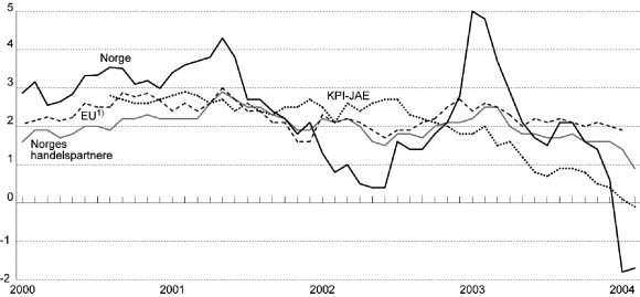 • Fra 2002 til 2003 ble prisveksten i Norge noe høyere enn i EU og hos handelspartnerne i gjennomsnitt. I gjennomsnitt var prisstigningstakten i Norge på 2,5 prosent, mens prisveksten i EU var 2,2 prosent og hos handelspartnerne 1,9 prosent. Det var særlig i de første fire månedene at tolvmånedersveksten i Norge var relativ høy. Mot slutten av 2003 kom tolvmånedersveksten i Norge i underkant av prisveksten i disse landene. Prisstigningen hos handelspartnerne ble gjennomsnittlig 1,1 prosent fra tomånedersperioden januar-februar 2003 til samme periode i 2004.