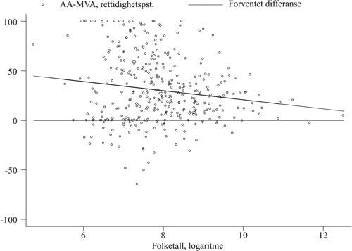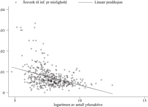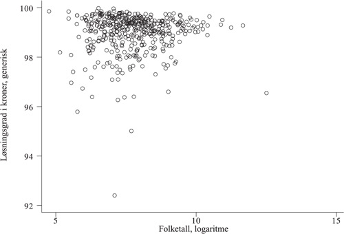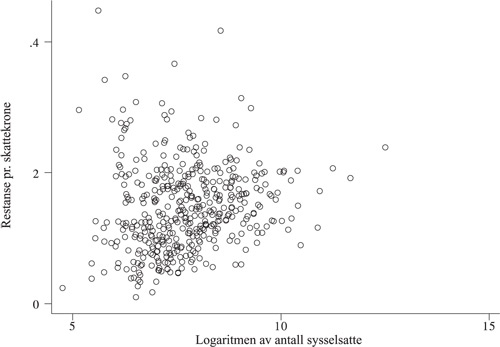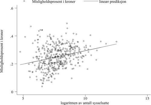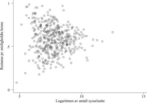 Resultatene viser en signifikant negativ relasjon mellom kommunestørrelse og restanseandel: En partiell økning i folketallet på en prosent gir, i følge den estimerte modellen, en bedring i løsningsgraden på 0.01 prosent poeng8 . Dette betyr at en partiell dobling av størrelsen er anslått å gi en bedring i løsningsgraden på ett prosentpoeng. Den empiriske modellen anslår at rundt 46 prosent av variasjonen i restanseandelen kan forklares av variasjonen av de inkluderte variablene.