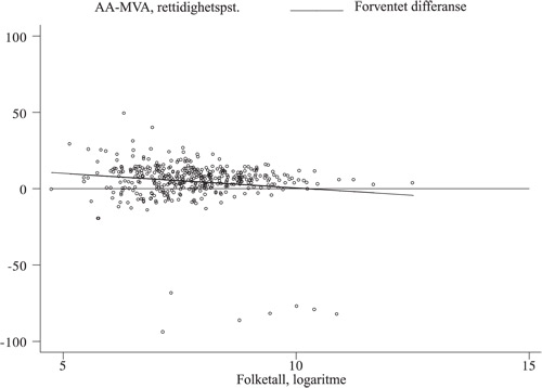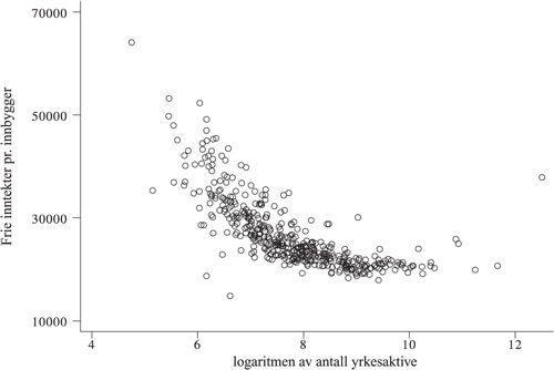 Kommunestørrelsen er målt ved logaritmen av folketallet. For funksjonen y = b ln (x) har vi for en liten endring Dx at Dy/Dx = b · 1/x, slik at Dy/Dx/x = b. Hvis vi dividerer med 100 på begge sider av den siste likningen ser vi at absolutt endring i y ved en prosents endring i x er gitt ved b/100. Hvis y er målt som en rate (ikke i prosent) gir b rett frem ett utrykk for antall prosentpoeng y endrer seg når x endrer seg med én prosent.