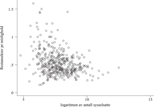 Sammenhengen mellom restanseandel og kommunestørrelse er imidlertid påvirket av sammenhengen mellom kommunestørrelse og misligholdsandel. Fra sammenhengen i figur 1.1 ser vi at dette gir en «statistisk ulempe» for de store kommunene. I figur 1.4 er derfor antall restanser pr. misligholdte restskattekrav plottet mot kommunestørrelse. Denne figuren viser ikke bare større variasjon blant de små kommunene, men gir også klarere bilde av at restansene gjennomgående faller med kommunestørrelsen 7 .