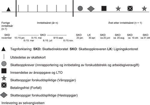 I figur 5.2 er det gitt en skjematisk oversikt over hvordan skattebetalingen forløper for personlige skattytere, fra utstedelse av skattekort til innbetaling av restskatt.