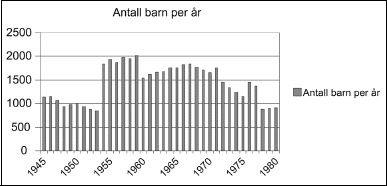 Figur 1.1 Totalt antall barn i barnehjem hvert år 1945–80. N= 50 654 barn/år. Tallet er ikke justert for barnas oppholdslengde på barnehjem.