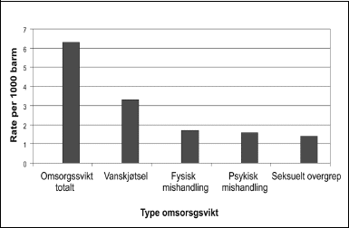 For Norge på 1990-tallet ligger raten i befolkningen på mellom 6 og 7 vanskjøttede barn per 1000. Denne raten er regnet ut ved hjelp av antall barn meldt til barnevernet for svært alvorlig omsorgssvikt. Figur 2 illustrerer dette. Den viser fordeling mellom ulike typer omsorgssvikt og rater per 1000 meldt til barnevernet i perioden 1993 til 2000 (Clausen 2004). Vanskjøtsel forekommer hyppigst, deretter fysisk, psykisk og seksuelt overgrep om lag like hyppig.