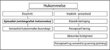 Skjemaet på figur 1 skiller mellom to hovedkategorier, eksplisitt og implisitt hukommelse. I eksplisitt hukommelse er tidligere erfaring tilgjengelig for bevisst gjenkalling og gjen-fortelling. Denne kategorien omfatter semantisk og episodisk hukommelse, som er to sammenvevde, men separate systemer for lagring av erfaringer. Skillet dekkes av dagliglivets skille mellom ”vite” og ”huske”. Semantisk hukommelse representerer kunnskapsreservoaret, et lager for de generelle og spesifikke fakta og opplysninger om historiske, bibliografiske og geografiske forhold. Det er ting vi vet, men ikke nødvendigvis husker når og hvordan vi lærte. Episodisk hukommelse bevarer de personlige minner, som er koblet til en tid og et sted (Tulving 2002) – dette kalles også selvbiografisk hukommelse.
