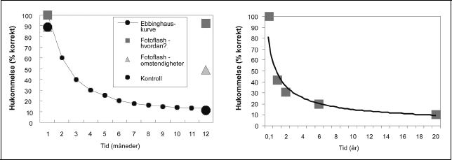 Venstre panel: Hukommelsen for en daglig hendelse en gitt dag (l) sammenlignet med hukommelsen for nyheten om en dramatisk hendelse (mordet på statsminister Olof Palme) testet tre uker og et år etter mordet (etter Christianson 1994). Resultatene representert ved n er antall informanter som korrekt erindrer hvordan de fikk nyheten, resultatene representert ved p er gjennomsnittet av flere spørsmål vedrørende omstendighetene rundt nyheten. Kurven er formen på den typiske glemselskurve og er her tilpasset resultatene fra daglighendelsen. Høyre panel viser resultater av selvbiografisk hukommelse for daglige hendelser over ett år, testet i intervaller fra 1 til 20 år senere (White 2002)