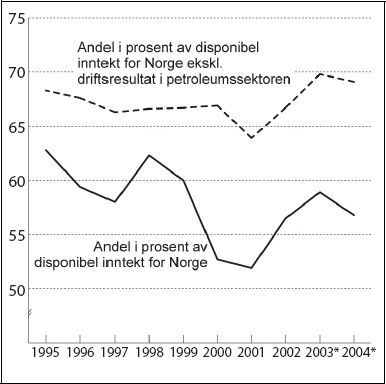 Ifølge foreløpige nasjonalregnskapstall økte disponibel realinntekt for Norge med 8 prosent fra 2003 til 2004 etter å ha hatt en moderat utvikling de tre foregående årene. En sterk vekst fra slutten av 1990-tallet og i 2000 førte til at nivået på disponibel realinntekt for Norge i 2004 lå nær 32 prosent høyere enn ved konjunkturtoppen i 1998 og nær 59 prosent høyere enn 10 år tidligere. Lønnskostnadene som andel av faktorinntekten i industrien har falt fra 84 prosent i 2003 til 83 prosent i 2004.