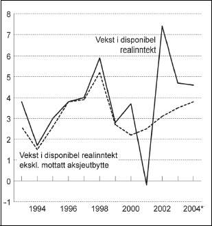 Tabell 2.1 viser husholdningenes inntekter og utgifter fordelt på ulike poster I perioden 1995 - 2004 var den gjennomsnittlige veksten i husholdningenes disponible realinntekt på 4,0 prosent per år. Ifølge nasjonalregnskapet økte husholdningenes disponible realinntekt med 4,6 prosent i 2004. De store svingningene i inntektsveksten i de siste årene, skyldes i all hovedsak både store positive og negative vekstbidrag fra mottatt aksjeutbytte. Størrelsen på utbetalt aksjeutbytte er trolig påvirket av skattemessige tilpasninger gjennom foretak der husholdningene eier majoriteten av aksjene. Figur 2.1 viser veksten i disponibel realinntekt og disponibel realinntekt eksklusive mottatt aksjeutbytte, og illustrerer hvilken betydning svingningene i mottatt aksjeutbytte har hatt for veksten i disponibel realinntekt.