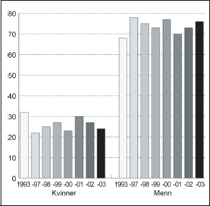 Figur 2.3 Prosentvis fordeling av kapitalinntekter mellom kvinner og menn. 1993 og 1997-2003.