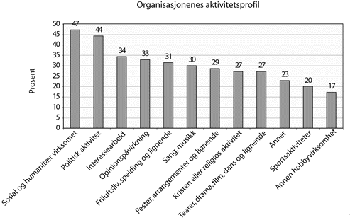 Som det framgår av figur 4.1, oppga nesten halvparten av organisasjonene i undersøkelsen å drive med sosial og humanitær virksomhet samt politisk aktivitet. Interessepolitisk arbeid samt opinionspåvirking følger tett på. Deretter følger ulike typer kultur- og fritidsaktiviteter. Agenda fant at den typiske organisasjonen drev med tre typer aktiviteter, og kommenterte at det er interessant at de typisk utadrettede aktivitetene rangerer høyest.