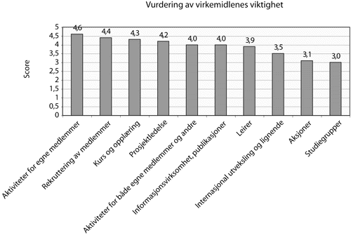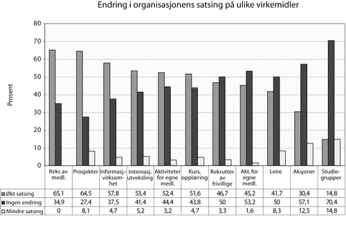 De viktigste virkemidlene, etter organisasjonens egne vurderinger, er: aktiviteter for egne medlemmer, rekruttering av medlemmer samt kurs og opplæring. Vi skal siden komme tilbake til hva denne prioriteringen kan bety for organisasjonenes posisjon som kanaler for politisk og samfunnsmessig påvirkning.