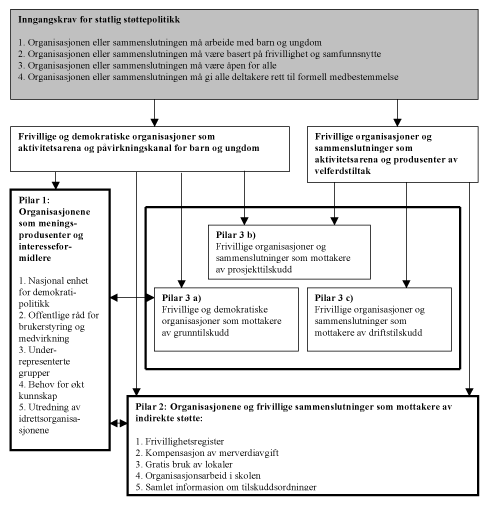 Statlige myndigheter som forholder seg til frivillige barne- og ungdomsorganisasjoner, frivillige sammenslutninger og interessefellesskap i barne- og ungdomsfeltet bør skille mellom støttepolitikk og tilskuddspolitikk til disse organisasjonene og sammenslutningene. Støttepolitikk bør defineres som alle tiltak som tar sikte på å skape samarbeid mellom myndighetene og den frivillige virksomheten samt bedre arbeidsvilkårene for frivillig sektor, mens begrepet tilskuddspolitikk bør reserveres den delen av støttepolitikken som dreier seg om direkte økonomiske tilskudd. For skille mellom ulike typer tilskudd og videreutvikling av tilskuddsordninger bør offentlige myndigheter legge kategoriseringen i St.meld. nr. 27 (1996-1997) til grunn.