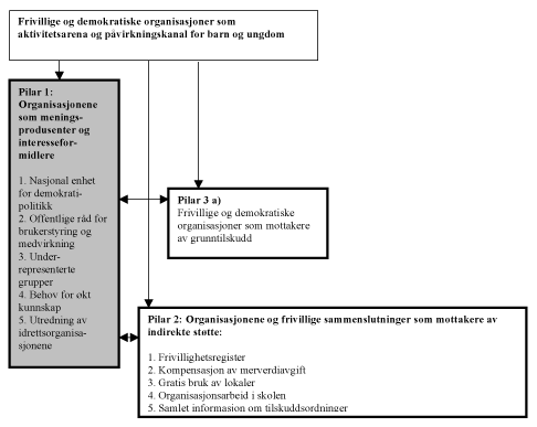 For tilskuddspolitikkens vedkommende viser utvalget til St.meld. nr. 27 (1996-1997) «Om statens forhold til frivillige organisasjoner» og meldingens kategorisering av tilskuddsordninger ut fra tre grunnleggende syn på frivillig virksomhet. Dette utvalget har anvendt kategoriseringen og begrunnelsene for statlige tilskudd med utgangspunkt i St.meld. nr. 27 (1996-1997), og finner at disse kategoriene i stor grad letter arbeidet både med å utvikle og begrunne ulike tilskuddsordninger samt vurdere enkeltorganisasjoners og –sammenslutningers naturlige plassering i et tilskuddsregime. Utvalget anbefaler at myndigheter som yter direkte økonomiske tilskudd til barne- og ungdomsorganisasjonene gjennomgår sin forvaltning av tilskuddsordnigner med tanke på å ordne begrunnelser og utforming av ordningene i tråd med kategoriseringen i St.meld. nr. 27 (1996-1997).