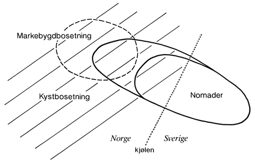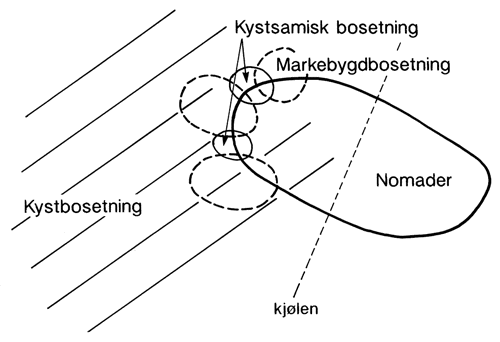 Figur 2.3 Modell 2. Nomadene, kystsamisk bosetning og markebygdbosetning innen undersøkelsesområdet første del av 1700-tallet.