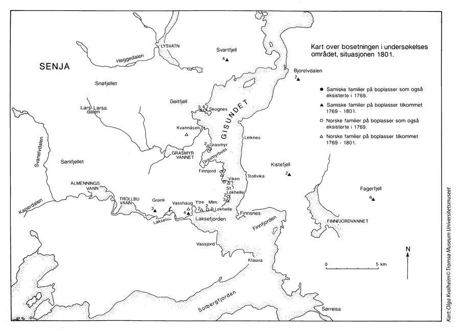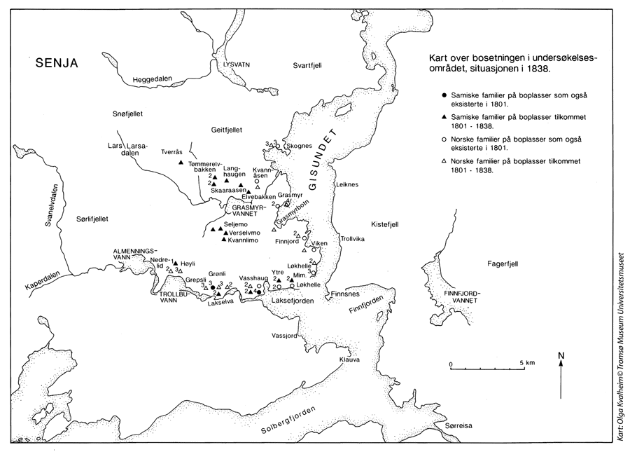 Undersøkelsen som utgjør utgangspunktet for artikkelen, omfatter både et regionalt og et lokalt undersøkelsesområde. Avgrensningen av disse områdene ble foretatt ut fra et ønske om å inkludere både tradisjonell kystsamebefolkning, markebygdsbefolkning og en gruppe nomader. Det regionale undersøkelsesområdet består av et vidstrakt område som strekker seg fra skogsbeltet i Jukkasjärvi sogn østenfor Kjølen og vestover til høyfjellsområdene og yttersiden av Senja. Det lokale undersøkelsesområdet ligger på østsiden av Senja, nærmere lokalisert til nordsiden av Lakselva rundt Gressmyrskogvannet. I studiet av de tre involverte befolkningsgruppene – kystsamene, den nomadiske befolkningen og den fremvoksende markebygdsbefolkningen – har jeg valgt å variere undersøkelsens fokus over tid: Når det gjelder den kystsamiske bosetningen, konsentrerer undersøkelsen seg om Gisund tinglag og det senere Lenvik herred. Hva angår den nomadiske befolkningen , derimot, står både Saarivuoma sameby i Jukkasjärvi prestegjeld og nomadenes bruksområder langs kysten i fokus. Og endelig studeres den fremvoksende markebygdbosetningen primært innenfor det lokale undersøkelsesområdet Gressmyrskogen. Gjennom en historisk-geografisk metode har jeg søkt å belyse oppkomsten og etableringen av markebygdene i det lokale undersøkelsesområdet, samt den tradisjonelle samiske ressursutnyttingen for de enkelte befolkningsgruppene. Undersøkelsesperioden omfatter i hovedsak perioden fra 1700 til 1900.