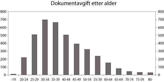 Dokumentavgiften ilegges ved tinglysning av dokument som overfører hjemmel til fast eiendom. I praksis betyr dette at dokumentavgiften ilegges ved flytting. Det er særlig unge i etableringsfasen som bytter bolig. Figur 9.6 viser samlet innbetalt dokumentavgift av privatpersoner fordelt på aldersgrupper. Dersom boligen kjøpes av to eller flere, er dokumentavgiften registrert på eldste kjøper. Figuren viser at det er aldersgruppen 25 til 45 år som hovedsakelig betaler dokumentavgiften.