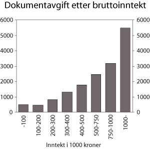 Figur 9.7 viser innbetalt dokumentavgift etter bruttoinntekt. Figuren viser at personer med høy inntekt betaler mer i dokumentavgift enn personer med lav inntekt, men innbetalt dokumentavgift øker om lag i samme takt som inntekten, unntatt for de med høyest inntekt.