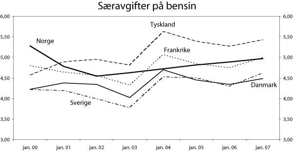 Figur 8.6 og 8.7 viser utviklingen i avgiftene på bensin og autodiesel i Danmark, Frankrike, Sverige, Tyskland og Norge. Figurene viser at drivstoffavgiftene i Norge ble betydelig redusert i 2000 og 2001 sammenliknet med de øvrige landene. Det gjøres oppmerksom på at endringer i valutakurser bidrar til noe av svingningene i avgiftene i figurene.