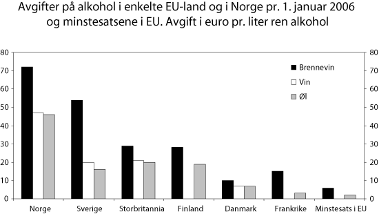 Alle land i EU har i dag avgifter på brennevin og øl. Flere land har også avgifter på vin. I EU er alkoholavgiftene regulert gjennom særskilte direktiver der bl.a. minstesatser for avgiftene er fastsatt. Utover minstesatsene står landene fritt til å fastsette satsene. For brennevin er minstesatsen 5,5 euro pr. liter ren alkohol, mens det ikke er noen krav om minstesats på vin. Minsteavgiften for øl er 1,87 euro pr. liter ren alkohol. EU-kommisjonen foreslo 8. september 2006 å justere opp minsteavgiftene på øl, sterkvin og sprit i EU tilsvarende inflasjonen siden 1993. Det ble ikke foreslått endringer i nullsatsen for vin. Forslaget er fortsatt under behandling. Figur 8.8 viser alkoholavgiftene i Norge, Sverige og Danmark i 2006 samt minstesatsene i EU. Alkoholavgiftene er høyere i Norge enn i Sverige og betydelig høyere enn i Danmark. De er også vesentlig høyere enn minstesatsene på brennevin og øl i EU.