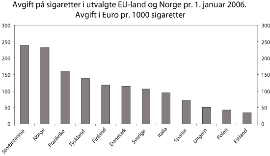Alle land i EU har også avgifter på tobakk. Ifølge EUs regelverk om minstesats for sigaretter, er medlemslandene forpliktet til å pålegge en stykkavgift og en verdiavgift uttrykt som prosentandel av maksimal utsalgspris. Disse komponentene må, sammen med merverdiavgiften, utgjøre minst 57 pst. av utsalgsprisen. Det er også knyttet krav til størrelsen på stykk- og verdiavgiftselementene. For rulletobakk kan enkelte medlemsland også ha en kombinasjon av vekt- og verdiavgift. I så fall må sammenlagt avgift, enten uttrykt som prosentsats eller beløp pr. kg, minimum tilsvare minstesatsene. Det er vanskelig å sammenlikne tobakkavgiftene mellom land fordi avgiftssystemene er så forskjellige. Som det går fram av figur 8.9 ligger avgiftene på norske sigaretter langt over nivået i flere EU-land. Dette er nærmere omtalt i St.meld. nr. 2 (2004-2005).