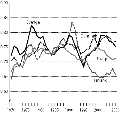 Figur 5.1 viser totale lønnskostnader som andel av faktorinntekten for Sverige, Danmark, Finland og Fastlands-Norge. Den tilsvarende lønnskostnadsandelen for Norge blir sterkt påvirket av lav lønnskostnadsandel i oljevirksomheten. I figur 5.1 har vi derfor valgt å vise lønnskostnadsandelen for Fastlands-Norge som den mest relevante størrelsen å sammenligne med andre land. Det framgår at lønnskostnadsandelen i Fastlands-Norge i 2006 var lavere enn i Sverige og Danmark, men høyere enn i Finland. Andelene i Danmark og Norge var relativt like fram til midten på 1980-tallet, men deretter har den totale lønnskostnadsandelen i Danmark ligget litt høyere enn i Norge. Lønnskostnadsandelen i Fastlands-Norge falt gradvis fra et nivå på 75 prosent i 2000 til 71 prosent i 2006. Til sammenligning han nevnes av den totale lønnskostnadsandelen i Norge (inklusive oljevirksomheten) var på 53 prosent i 2006. I Danmark nådde lønnskostnadsandelen en topp i 2003 med 79 prosent, men har deretter falt og var i 2006 på 77 prosent. I Sverige har lønnskostnadsandelen variert mer enn i de to andre landene. Fra 1995 til 2002 økte den fra 68 prosent til 79 prosent, men falt deretter til om lag samme nivå som i Danmark i 2006. I Finland som hadde om lag samme andel som Norge i 1970, har andelen sunket gradvis fra 1991 og fram til 2006. I 2006 utgjorde de finske lønnskostnadene 66 prosent av faktorinntekten. Det gjøres oppmerksom på at forskjeller i næringsstruktur i landene vil påvirke lønnskostnadsandelene.