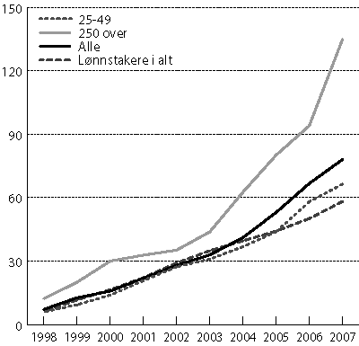 4 Omfatter det kommunale- og det statlige tariffområdet og de statlig eide helseforetakene. NSB BA og Posten Norge BA er ikke med i tallene fra og med 1999. Stillinger med bare lokal lønnsdannelse i kommunene er med fra og med 2003. Oslo kommune er med i tallene fra 2003.