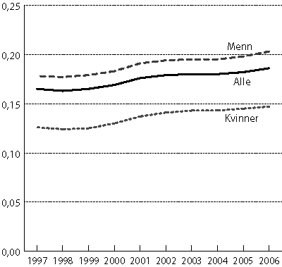 Tabell 1.18 viser også fordelingen av lønnsinntekt blant menn og kvinner. Spredningen i lønnsinntekt målt ved Gini-koeffisienten er større blant menn enn kvinner; 0,203 for menn og 0,147 for kvinner i 2006. På den annen side har økningen i spredningen fra 1997 til 2006 vært større blant kvinner enn for menn, jf. figur 1.2.
