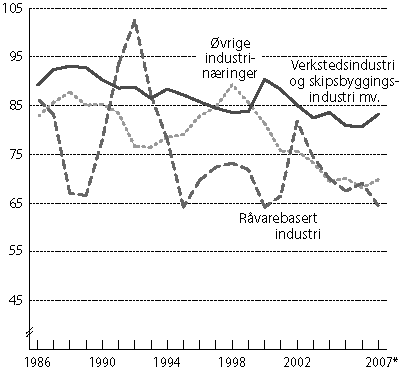 I markedsrettet virksomhet i Fastlands-Norge økte lønnskostnadsandelen i årene 1995-2000, og i 2000 var lønnskostnadsandelen oppe i 70,7 prosent. Fra 2000 falt imidlertid lønnskostnadsandelen hvert hvert år fram til 2005, da andelen kom ned i 63,8 prosent. Nivået på lønnskostnadsandelen det året er det laveste som er observert etter 1970. De foreløpige nasjonalregnskapstallene viser at lønnskostnadsandelen for dette aggregatet økte med 1,6 prosentpoeng i 2006, og med ytterligere 0,9 prosentpoeng i 2007, til 65,4 prosent i 2007. I industrien hadde lønnskostnadsandelen en topp i 1998 med 83,1 prosent. Ifølge nasjonalregnskapets tall fram til og med 2006 har lønnskostnadsandelen i industrien falt hvert år i perioden 2002 til 2006. Nedgangen var ifølge nasjonalregnskapet mest markert i 2003 og 2004. For 2006 er lønnskostnadsandelen foreløpig beregnet til 73,4 prosent, mens den økte med et knapt prosentpoeng fra 2006 til 2007, til 74,2 prosent. Den klare nedadgående trenden på slutten av 1990- og 2000-tallet har medført at lønnskostnadsandelen de siste årene har ligget på et historisk lavt nivå. Den lave lønnskostnadsandelen i årene 2003-2007 må ses i sammenheng med de forhold som påvirket driftsresultatet i disse årene jf. omtalen av industriens driftsresultat i dette avsnitt. I utvalget av øvrige næringer var det en reduksjon i lønnskostnadsandelen hvert år fra 2000 fram til og med 2005. De foreløpige nasjonalregnskapstallene viser at lønnskostnadsandelen økte til 74,0 prosent i 2006, for deretter å holde seg uendret fra 2006 til 2007. Figur 6.4 viser utviklingen i lønnskostnadene som andel av faktorinntekten for ulike deler av industrien. I 2000 var lønnskostnadsandelen i verkstedsindustrien høyere enn noen gang tidligere på 1990-tallet. I årene 2000 - 2006, med unntak for 2004, da det var en mindre oppgang, sank lønnskostnadsandelen hvert år. Fra 2006 til 2007 økte lønnskostnadene ifølge de foreløpige nasjonalregnskapstallene sterkt, og lønnskostnadsandelen var vel 83 prosent i 2007. I råvarebasert industri er det spesielt store fluktuasjoner i lønnskostnadsandelen, noe som reflekterer konjunkturfølsomheten i denne virksomheten. Store prisendringer gir seg utslag i kraftige svingninger i faktorinntekt og driftsresultat. I perioden 1995 - 2001 lå lønnskostnadsandelen i intervallet 65 - 75 prosent. I 2002 var det en kraftig økning, slik at andelen dette året kom opp i overkant av 81 prosent. I årene 2003-2007 falt lønnskostnadsandelen i råvarebasert industri hvert år, og i 2007 var andelen i underkant av 65 prosent. I øvrig industri var det gjennom konjunkturoppgangen på 1990-tallet en jevn og sterk økning i lønnskostnadsandelen, og andelen nådde en topp i 1998 med drøyt 89 prosent. Vekst i driftsresultatet i næringsmiddelindustri var med å bidra til at andelen deretter falt i åtte år og kom ned i vel 68 prosent i 2006. Ifølge de foreløpige nasjonalregskapstallene økte lønnskostnadsandelen med knapt 2 prosentpoeng i 2007.