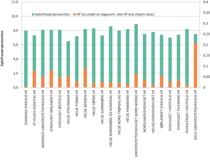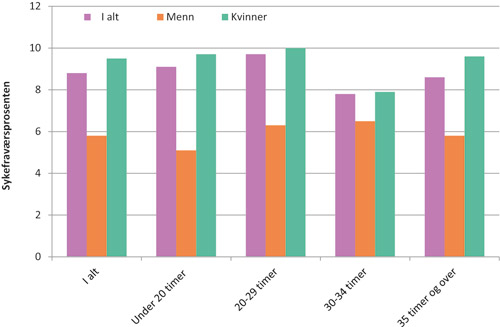 Innenfor helse- og omsorgssektoren er det særlig i omsorgstjenestene at sykefraværet er høyt, over 10 prosent. I primærtjenestene er det under 7 prosent og i spesialisthelsetjenestene ligger det under 8 prosent. Det er også forskjeller i sykefravær mellom ulike helseforetak og mellom kommuner som tyder på at det er et potensial for å redusere fraværet. Det er sosiale forskjeller både i sykefravær og utstøting fra arbeidslivet blant sysselsatte i helse- og omsorgssektoren. Kvinner som arbeider mindre enn 30 timer i uken har høyest sykefravær. Kvinner som arbeider mellom 30 og 34 timer har imidlertid lavere sykefravær enn kvinner som arbeider heltid.