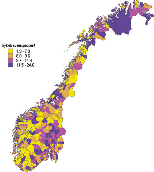 I følge sykefraværsstatistikken for andre kvartal 2010 var det samlede sykefraværet i Norge på 6,3 prosent. Det tilsvarer en nedgang på 10,7 prosent sammenlignet med samme kvartal 2009. Det legemeldte sykefraværet var 5,5 prosent andre kvartal 2010. Det tilsvarer en nedgang på 12,3 prosent. Det legemeldte sykefraværet var 7,1 prosent for kvinner og 4,3 prosent for menn. Sammenlignet med fraværet i andre kvartal 2009, gikk sykefraværet ned 14 prosent for menn og 10,8 prosent for kvinner. Sykefraværet gikk ned i alle aldersgrupper.