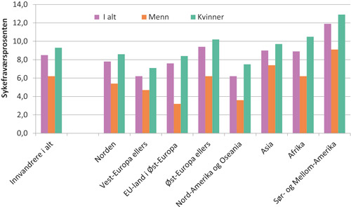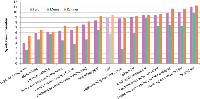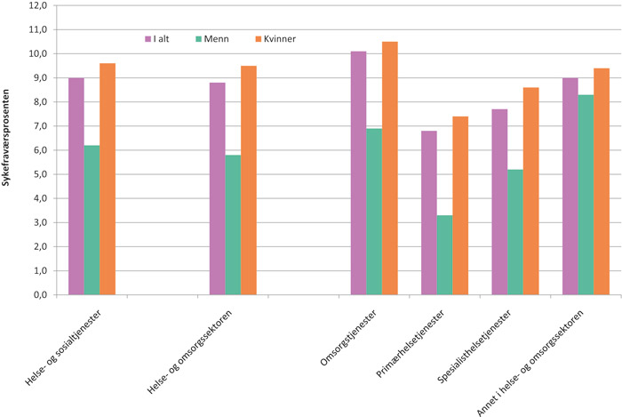 Data fra arbeidskraftundersøkelsen viser at det har vært en betydelig økning i sykefraværet i næringskategorien helse- og sosialtjenester sammenlignet med det samlede fraværet i Norge. Mens fraværet i helse- og sosialtjenesten omtrent tilsvarte det samlede fraværet i 1980, var fraværet i helse- og sosialtjenestene omtrent 30 prosent høyere enn det samlede fraværet i 2009. Helse- og omsorgssektoren er den næringen med absolutt høyest kvinneandel og dette er den viktigste forklaringen på at sykefraværet er relativt høyt sammenlignet med andre næringer. Sykefraværet blant menn i helse- og omsorgssektoren er imidlertid også høyere enn gjennomsnittsfraværet for menn. En sammenligning av sykefraværet blant pleiepersonell og annet personell med tilsvarende utdanning i et utvalg europeiske land tyder på at sykefraværet blant pleiepersonellet er noe høyere i Norge. Sannsynligvis reflekterer dette imidlertid bare det faktum at sykefraværet generelt er høyt i Norge.