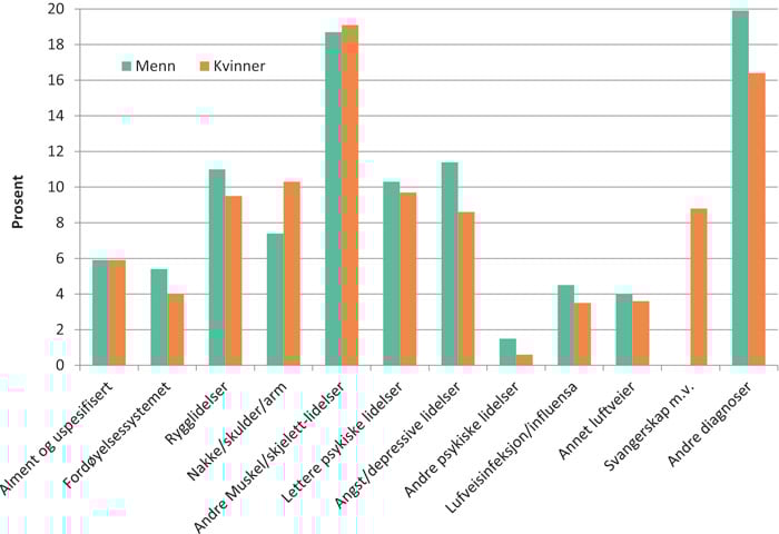 Om lag 40 prosent av de legemeldte sykefraværsdagsverkene er diagnostisert som muskel- og skjelettlidelser. Dette er omtrent det samme som i befolkningen som helhet. Diagnoser som gjelder psykiske lidelser står for nesten 20 prosent av sykefraværsdagsverkene. For kvinner utgjorde svangerskapsrelaterte lidelser en ikke ubetydelig diagnosegruppe. Andelen av fraværet som skyldtes muskel- og skjelettlidelser var spesielt stort blant renholdere, kokker eller kjøkkenassistenter og pleie- og omsorgsarbeidere. Psykiske lidelser er vanligst i yrkesgruppen sosionom, vernepleier og barnevernspedagog, og for mellomledere.