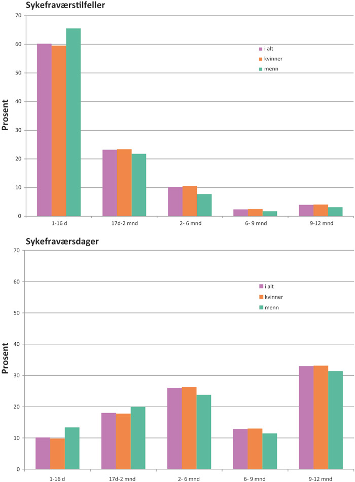 Det er de lange sykefraværene som utgjør den største delen av sykefraværsdagene. Sykefravær med varighet over to måneder utgjør nesten 72 prosent av alle sykefraværsdagene. Fravær over 9 måneder utgjør alene 33 prosent av alle fraværsdagene. I mandatet er det lagt spesiell vekt på overgangen fra lange sykefravær til mer permanent utstøting fra arbeidslivet. Blant arbeidstakere i helse- og omsorgssektoren som har brukt opp sykepengeretten, var om lag en femtedel tilbake i arbeid, drøyt halvparten er på rehabilitering eller attføring, og om lag en femtedel uførepensjonert, 3 måneder senere.