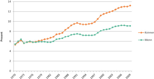 Figur 3.2 viser andel uføremottakere etter kjønn i prosent av befolkningen fra 1970 fram til 2009. Fram til 1980 var uføreraten den samme for kvinner og menn. Andel uføremottakere har økt for kvinner siden 1979 og for menn siden begynnelsen av 1980-tallet. Økningen har vært sterkere for kvinner enn for menn. I 2009 var 13 prosent av kvinnene og 9 prosent av mennene uføretrygdet.2