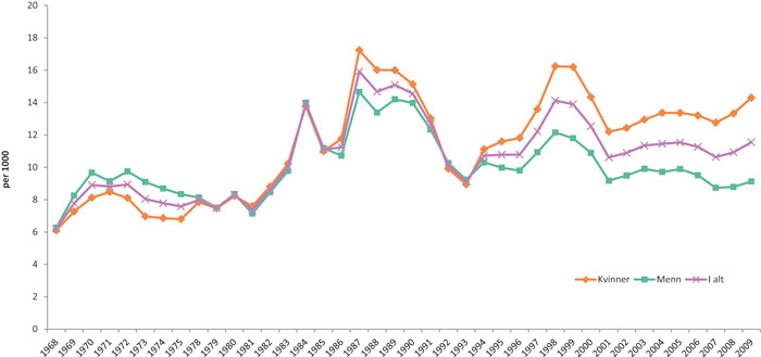 Figur 3.3 Nye uførepensjonerte per 1000 innbyggere i alderen 18 – 66 år i perioden 1968 til 2009. Aldersstandardisert.