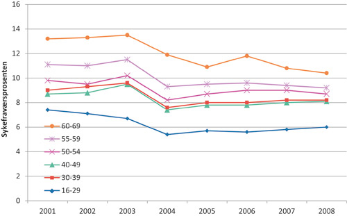 Data fra sykefraværsstatistikken for helse- og omsorgssektoren bekrefter at utviklingen i legemeldt sykefravær er relativt lik for de ulike aldersgruppene over perioden 2001 – 2008 (figur 3.5). Resultatet blir det samme dersom sykefraværsprosenten i 2009 aldersjusteres.5 Ved å legge alderssammensetningen i 2001 til grunn ved beregningen av sykefraværsprosenten i 2009 forblir den uendret på 8,8 prosent. Endringen i sykefraværet fra 2001 til 2009 er altså ikke et uttrykk for endringer i alderssammensetningen i helse- og omsorgssektoren.