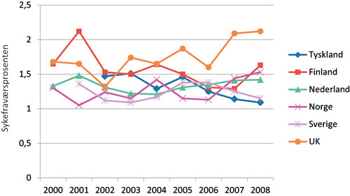 Sykefraværet blant pleiepersonell i Norge sammenlignes med Sverige, Finland, Nederland, UK (Storbritannia og Nord-Irland) og Tyskland i perioden fra 2000 til 2008. Det er lagt vekt på å inkludere sammenlignbare land i analysen. Danmark er ikke inkludert siden antall observasjoner i det danske datamaterialet er for lite til å studere undergruppen pleiepersonell. Av samme grunn er data fra 2000 for Sverige utelatt. For Tyskland foreligger det bare data for 2002 til 2008. Alle estimater er dermed basert på minst 1700 observasjoner.