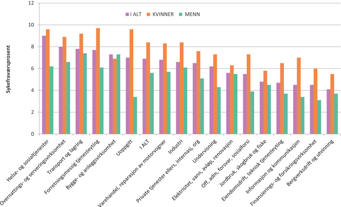 Figur 3.8 viser samtidig at selv om det samlede sykefraværet i helse- og omsorgssektoren er høyt sammenlignet med andre sektorer, gjelder ikke dette i samme grad for menn. Fraværsprosenten for menn er lavere i helse- og sosialtjenesten enn i næringene overnattings- og serveringsvirksomhet, transport og lagring, og bygge- og anleggsvirksomhet.