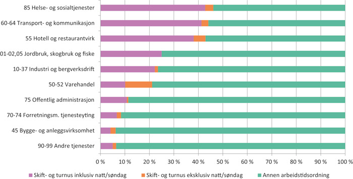 Helse- og sosialtjenester er den næringen som har høyest andel ansatte med skift- eller turnusarbeid. Figur 4.1 viser at det både i helse- og sosialtjenester, transport og kommunikasjon, hotell og restaurant var mer enn 40 prosent av de ansatte som hadde arbeidstidsordninger med skift- eller turnus. Helse- og sosialtjenester er i tillegg den næringen med høyest andel sysselsatte som har en arbeidstidsordning som kombinerer dag- og nattarbeid i roterende turnus (37 prosent) (NOU 2008:17). Om lag 86 prosent av omsorgsarbeiderne og hjelpepleierne arbeider turnus, og om lag 70 prosent av sykepleierne. Andelen som har en arbeidstidsordning som kombinerer dag- og nattarbeid er også høy blant leger (64 prosent).