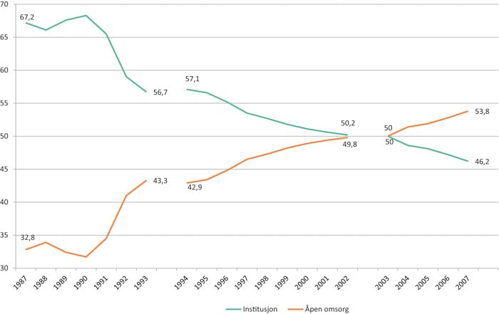 Dette er bakgrunnen for at antall institusjonsplasser er blitt redusert de siste tiårene, mens tallet på boliger til pleie- og omsorgsformål har hatt en betydelig vekst. Samtidig er tallet på beboere i institusjon redusert fra 45 600 i 1992 til 44 400 i 2009. Det er først og fremst de gamle aldershjemmene som er tatt ut av drift, mens tallet på sykehjemsplasser har vokst. I tillegg er det kommet barneboliger og avlastningsinstitusjoner for yngre brukergrupper. Tallet på boliger til pleie- og omsorgsformål har vokst fra om lag 28 000 boliger for 20 år siden til nesten 50 000 boliger i dag.