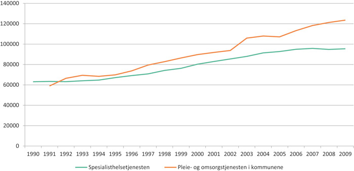 Under kapittel 4.2 presenteres imidlertid årsverksutviklingen i pleie- og omsorgstjenesten i kommunene for perioden1991-2009. Tilsvarende tall presenteres for spesialisthelsetjenesten under kapittel 4.3.